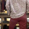 La blusa es de manga larga y tiene un estampado animal print en tonos burdeos, rosados y crema. El tejido es ligero y con una caída fluida, lo que le da un aire cómodo y elegante. El escote es en forma de “V” y el diseño general es suelto, ideal para llevar tanto por dentro como por fuera del pantalón.