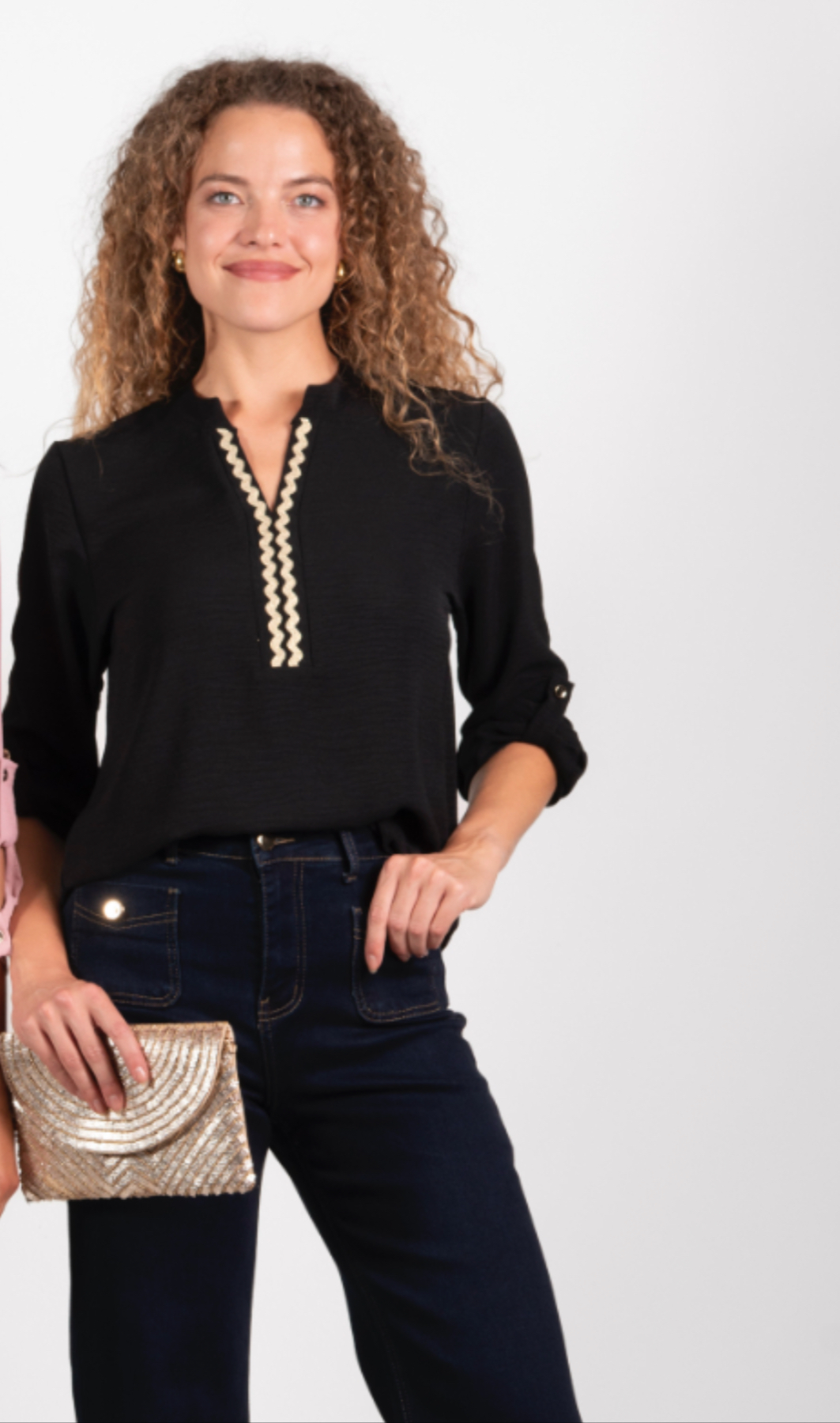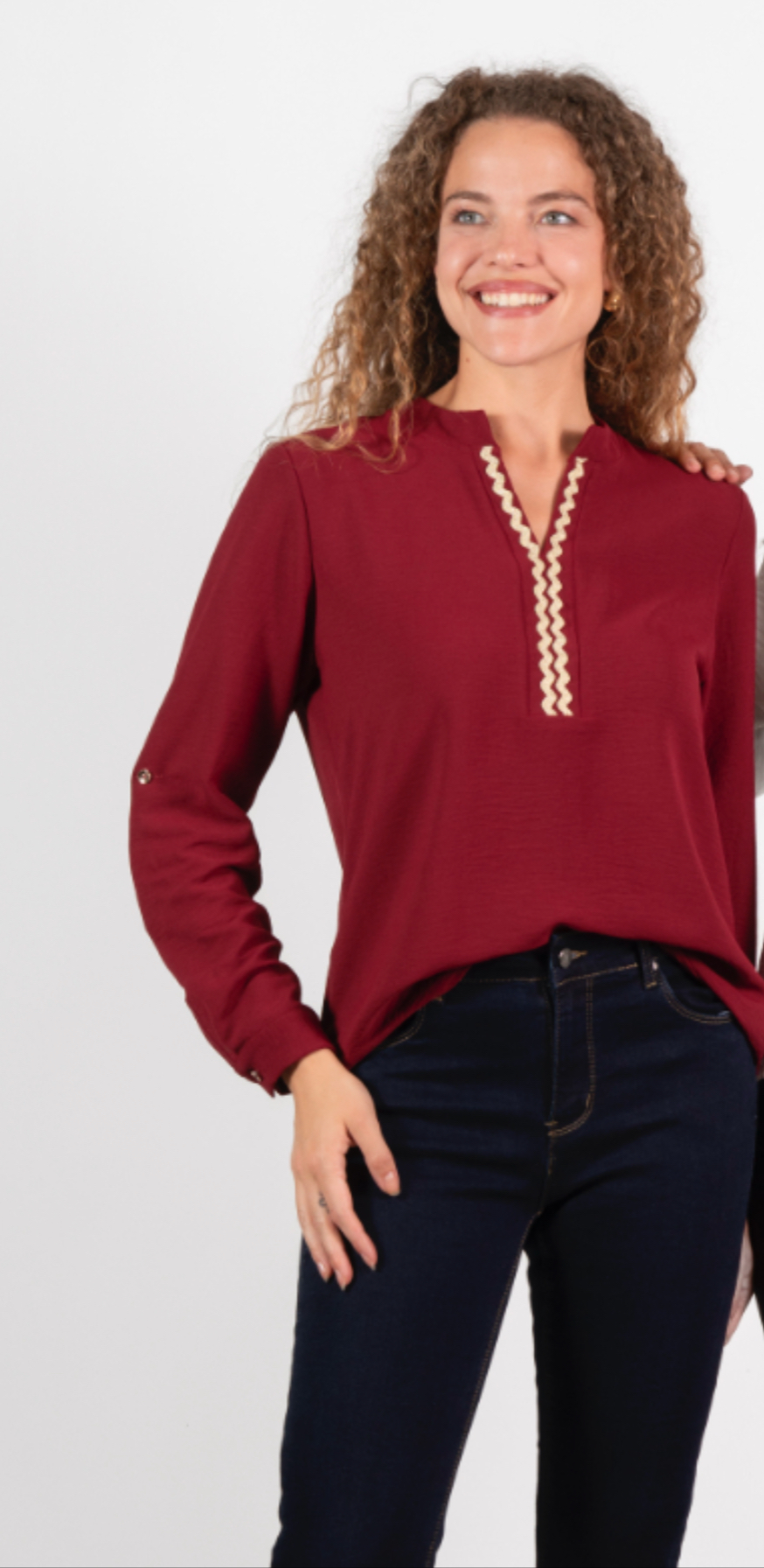 La blusa es de color negro o granate , con un diseño elegante y versátil. Destaca por su escote en forma de V adornado con una aplicación en zigzag en tono beige y oro, que le da un detalle distintivo y sofisticado.
