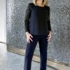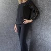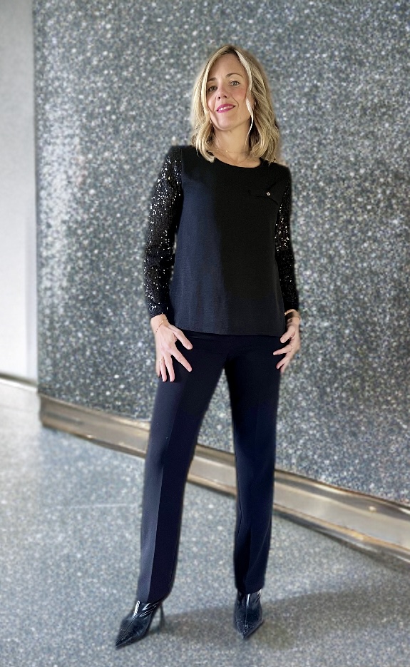 Blusa elegante de corte recto en color negro, perfecta para aportar un toque sofisticado a cualquier look. Destaca por sus mangas largas confeccionadas en un tejido con brillo y detalles de lentejuelas, que añaden un efecto luminoso y festivo sin perder la comodidad. El cuerpo es liso y suave, con un pequeño bolsillo decorativo en la parte superior que aporta un detalle chic. Ideal para combinar con pantalones o faldas en ocasiones especiales, cenas o eventos donde quieras lucir un estilo moderno y refinado.