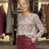 La camiseta es de manga larga y presenta un diseño con estampado en tonos azules y blancos, con un estilo que recuerda al tie-dye o efecto acuarela. El patrón crea líneas diagonales que aportan dinamismo al look. El cuello es redondo y está rematado con un detalle de trenza del mismo tono azul. La tela de punto fino, ideal para entretiempo.