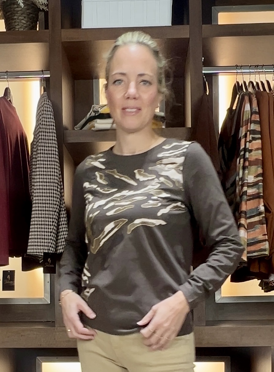 Camiseta de algodón con dibujos de manchas serigrafiados con aplicaciones de lentejuelas. Cuello redondo y manga larga. Espalda lisa.