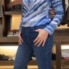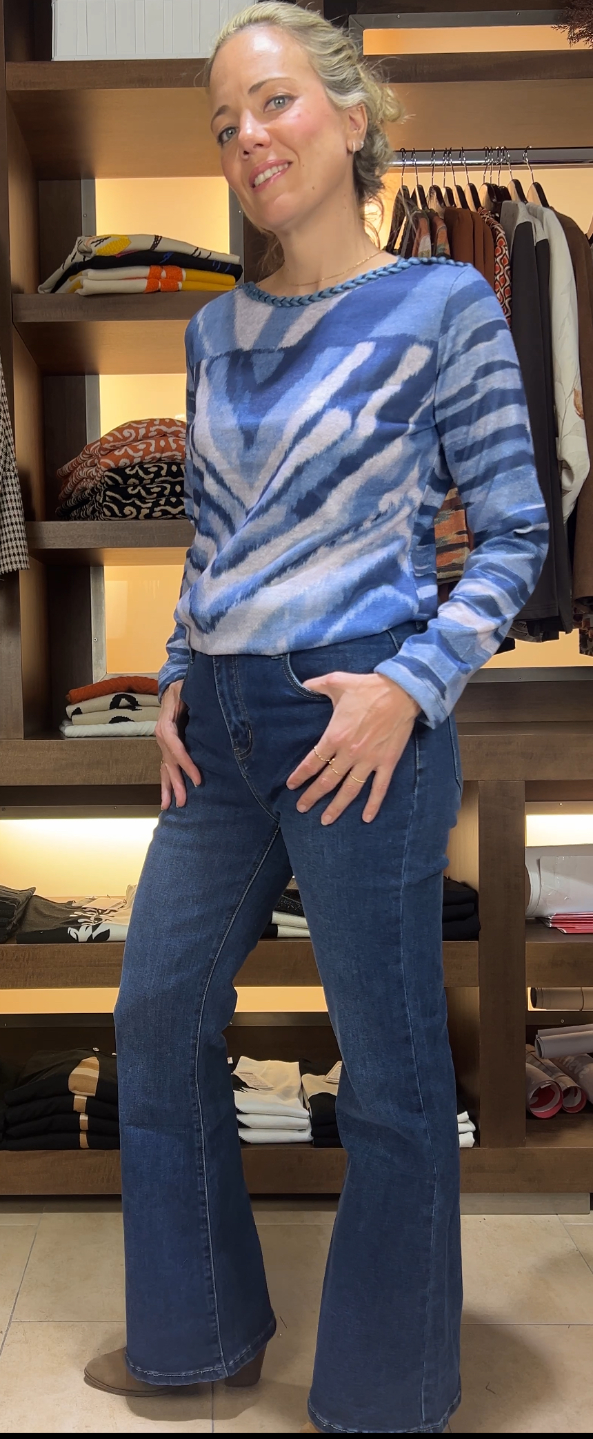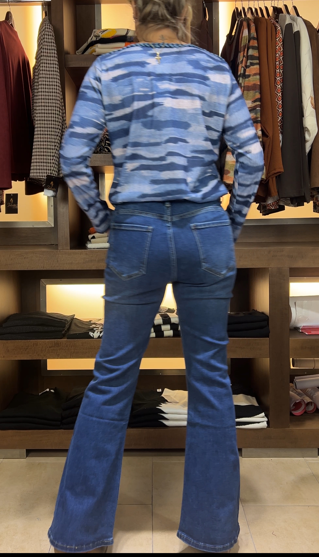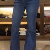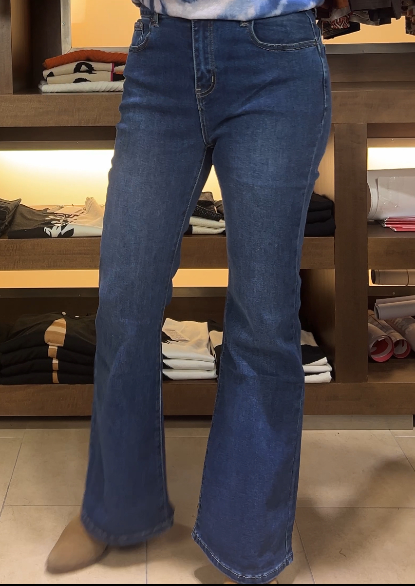 El jean es de tiro alto y tiene un corte bootcut, ajustado en la parte superior y con una leve campana desde la rodilla hacia abajo, lo que estiliza la figura y alarga visualmente las piernas. Está confeccionado en denim azul medio con costuras visibles en tono más oscuro que le dan un toque clásico. No presenta roturas ni desgastes, lo que lo hace versátil y elegante, ideal tanto para looks casuales como más arreglados.