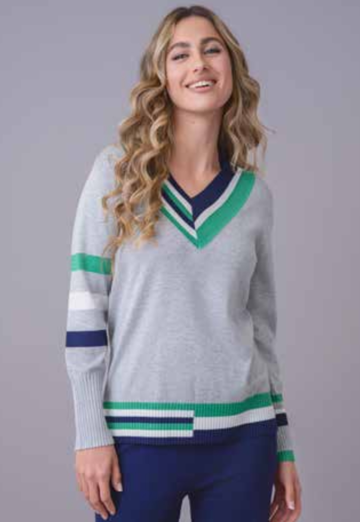 - Mangas: largas, con franjas horizontales en tonos gris, blanco, verde y azul marino en una de ellas, creando contraste.