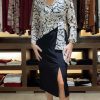 - El contraste entre el estampado superior y la falda lisa genera un efecto visual estilizador.