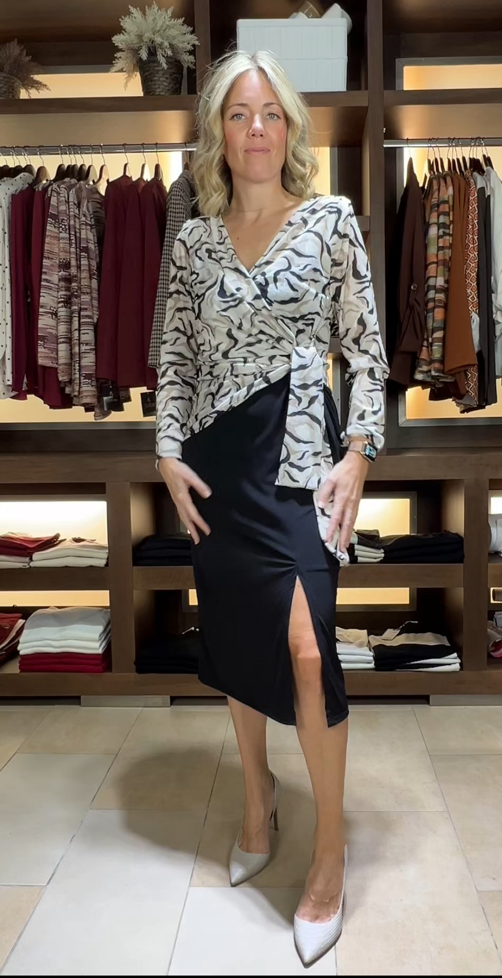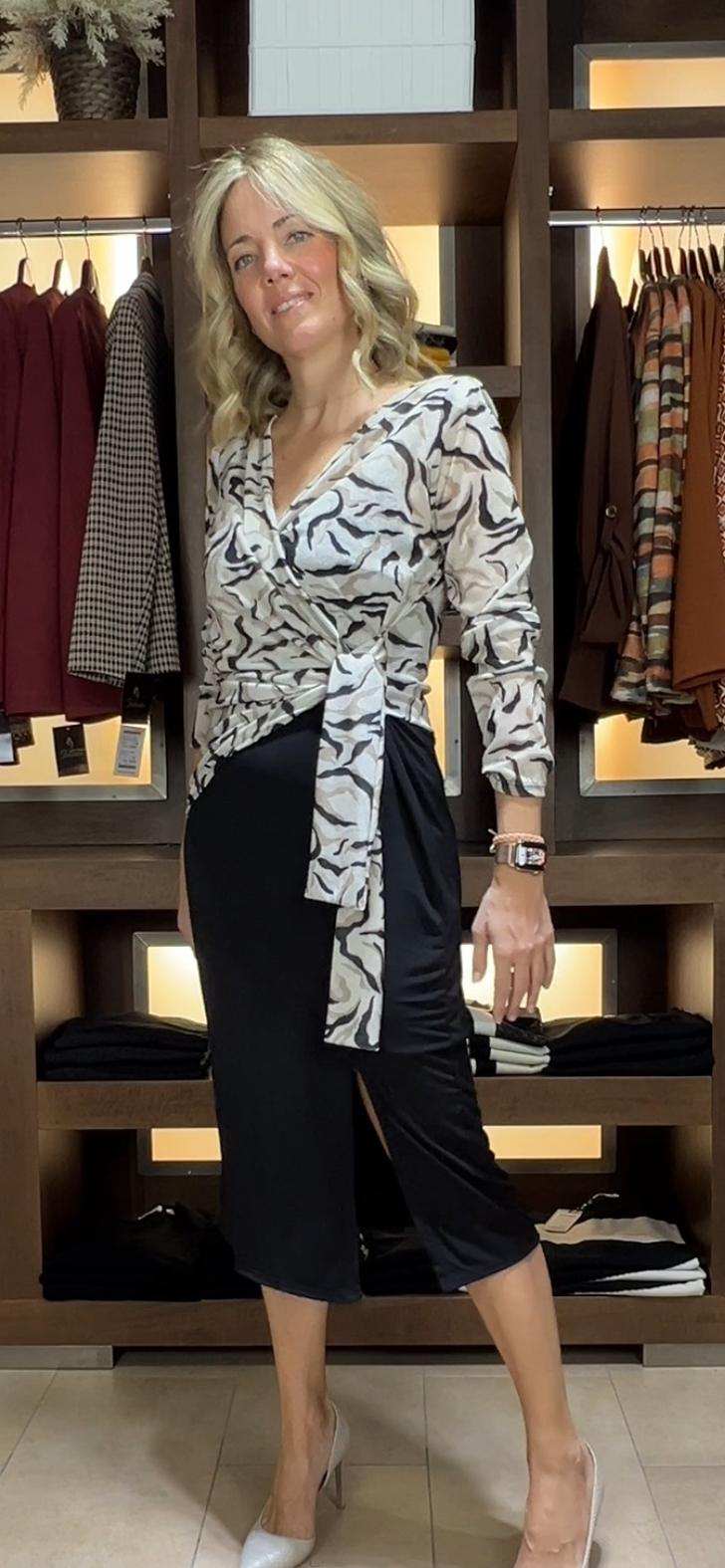 - Parte superior: estilo wrap (cruzado al frente) con escote en “V” favorecedor.