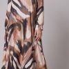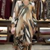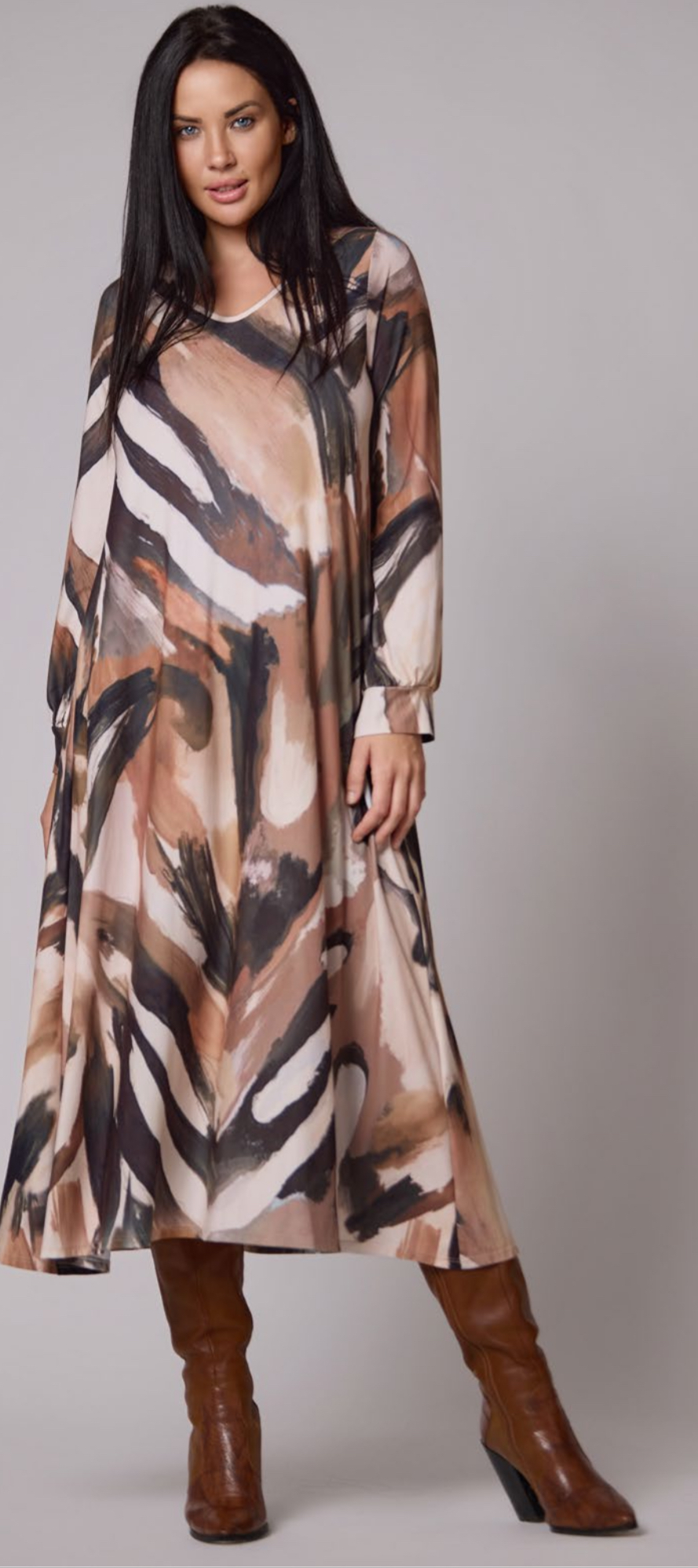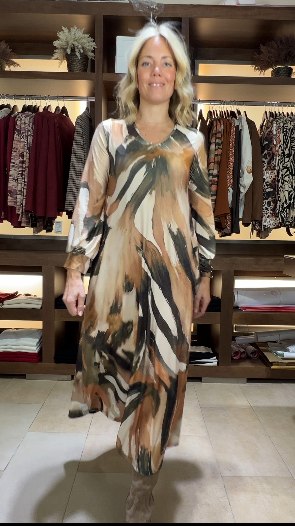 Vestido largo estampado en punto frío, Cuello en V, manga larga con puño, bolsillos laterales. Estampado abstracto en tonos tierra.
