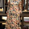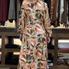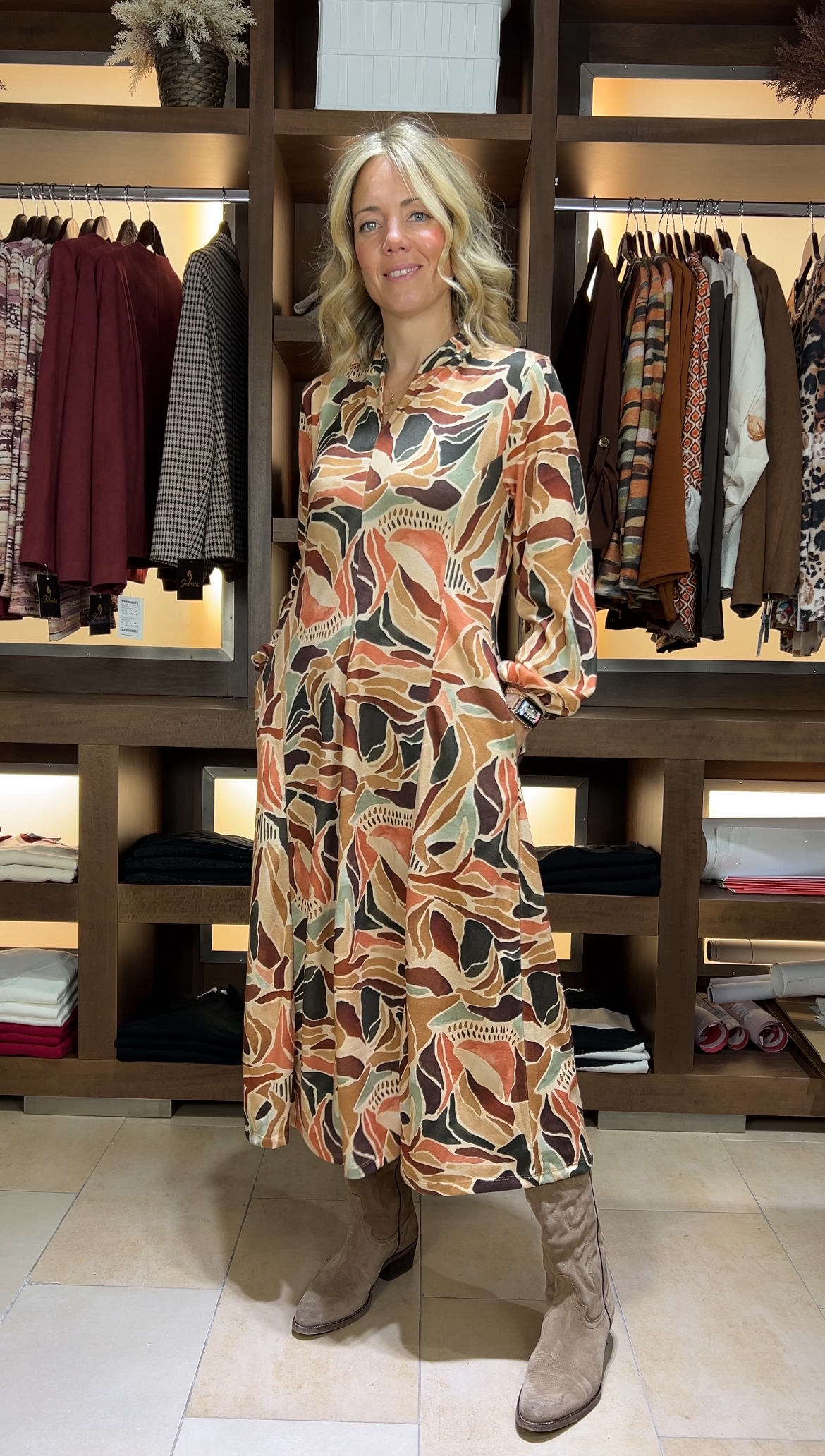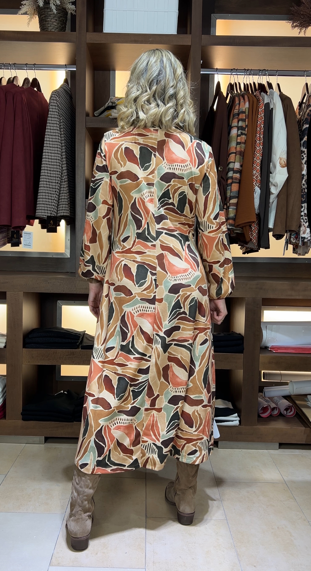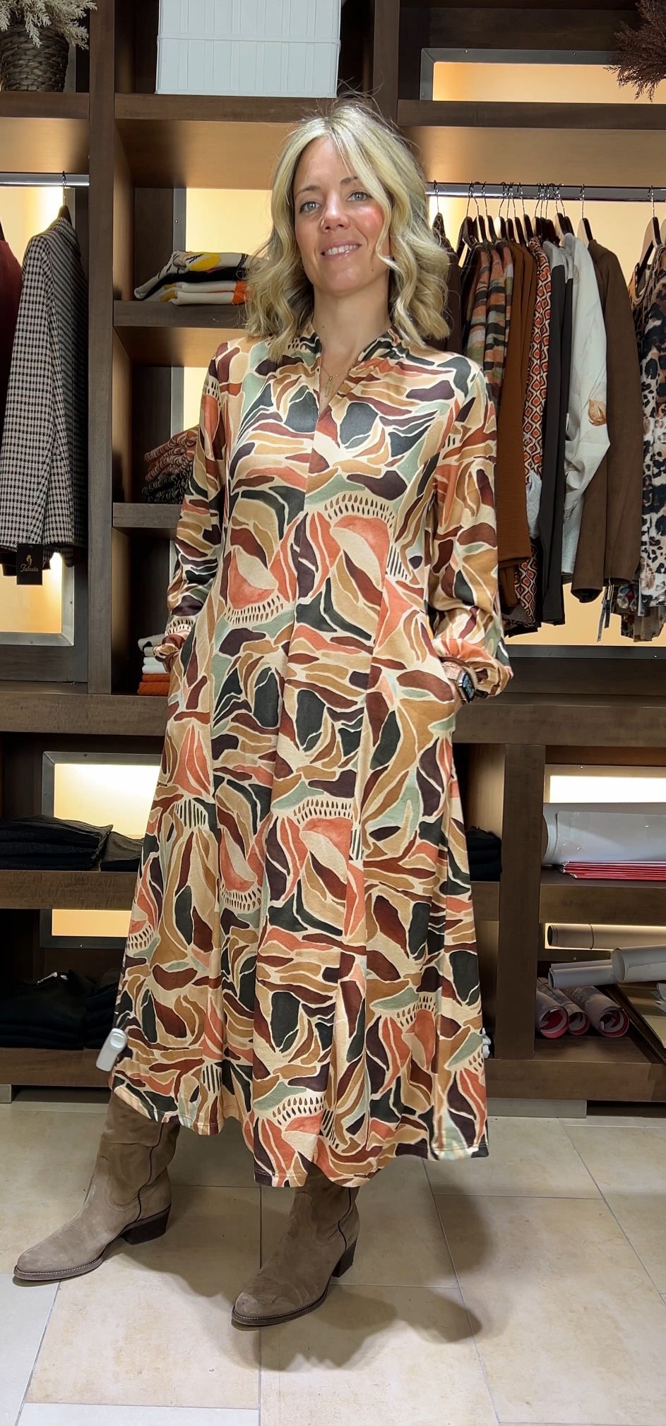 Vestido largo de punto estampado en tonos tierra. Cuello en V con pliegue en el pecho, lo que aporta movimiento. Manga larga ablusada con puño. Con bolsillos.