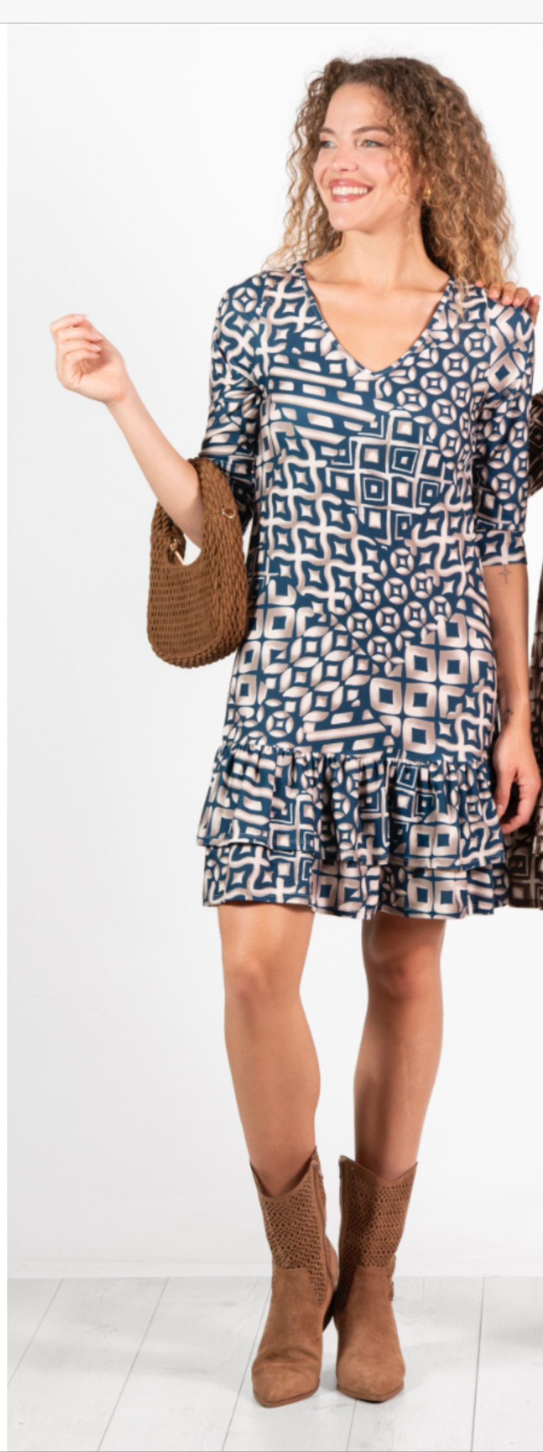 Vestido de punto frío, estampado de patchwork con geométricos. Corte recto con dos volantes en el bajo, largo por la rodilla, manga al codo.